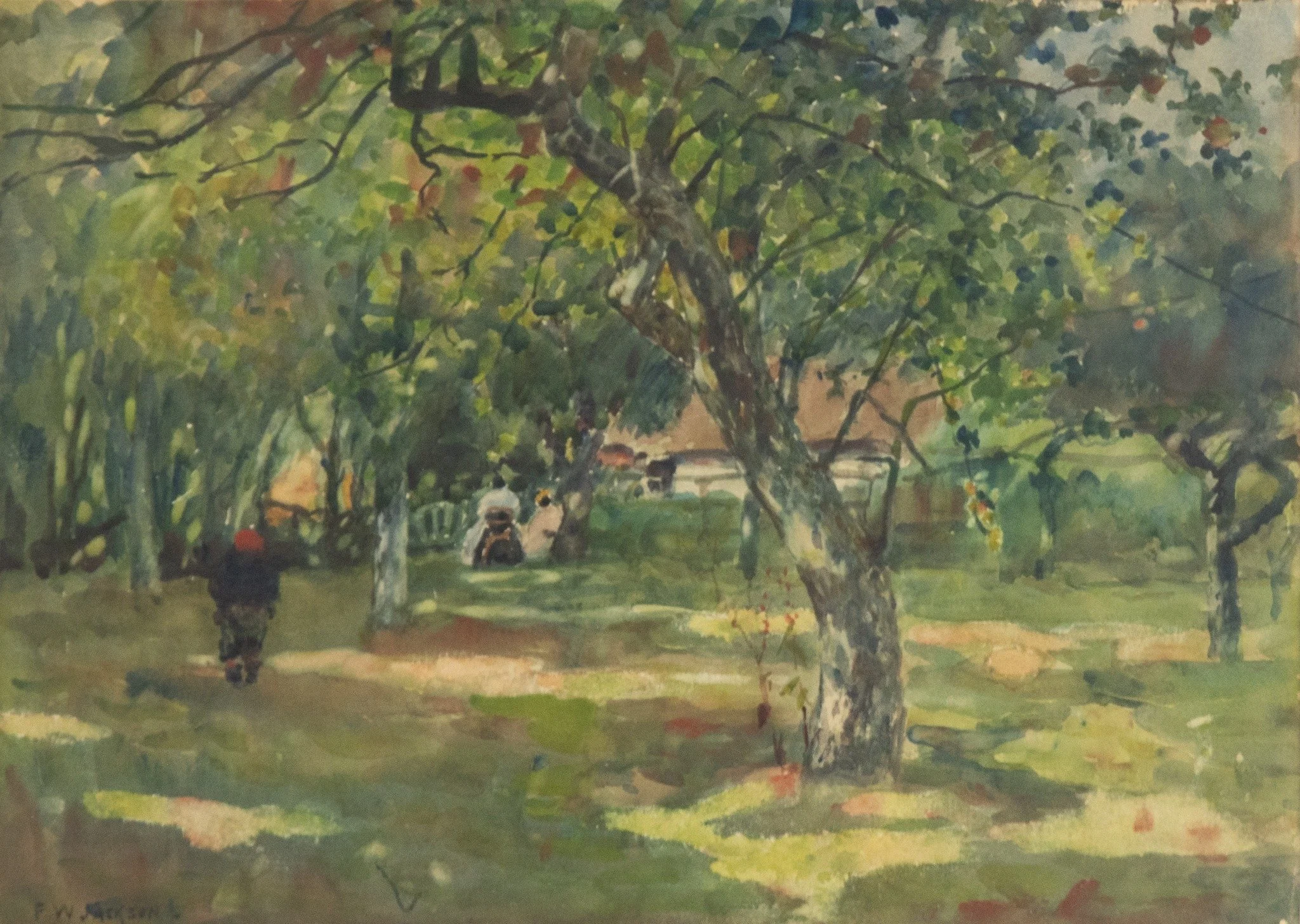 Frederick William Jackson NEAC, Figures in an orchard, Watercolour (35 x 25cm), framed and glazed (53 x 44cm). Signed.