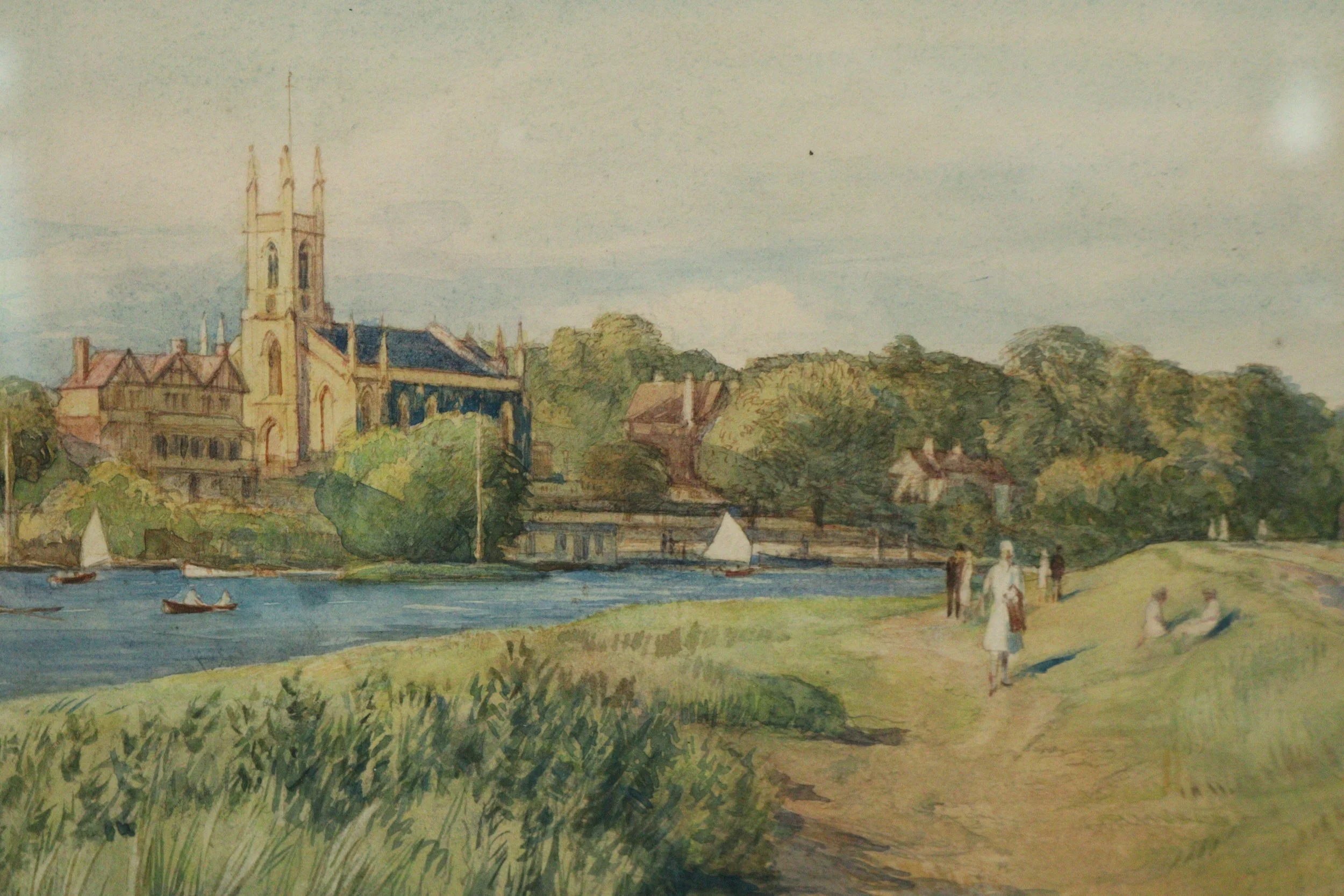 Francis Dodd NEAC, A river landscape with figures on the path, sailing boats and a church in the distance (1929), Watercolour (35 x 25cm), framed and glazed (60.5 x 49cm). Signed.
